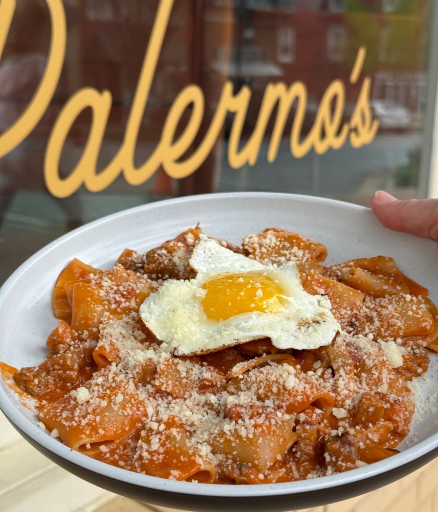 Sometimes less is more. Many of the classic Roman pasta dishes use very few ingredients but a great deal of technique to get just right. Cacio e Pepe and Carbonara are as synonymous with Rome as cowboy boots are to a rodeo. There is another classic Roman pasta dish that is lesser known. This is the Pasta alla Zozzona. The word Zozzona literally translates to “filthy”. We think it’s because this dish is over the top – in the best way possible. It starts with some crispy pork belly, we add our sweet fennel Italian sausage and some of our Palermo’s red sauce. To that we add the pasta with plenty of the pasta water, a handful of freshly grated pecorino cheese and a mixture of egg yolk and more pecorino cheese. We mix in the egg yolk and cheese off the heat, stirring vigorously to combine and let the egg yolks cook through without scrambling. The result is a velvety, bright, acidic sauce that is has a nice salty bite from the pork belly and the floral notes from the fennel. To be sure you know what you are getting, we event top it with a fried egg to let a little bit more egg yolk make the dish that much more “filthy” and awesome!