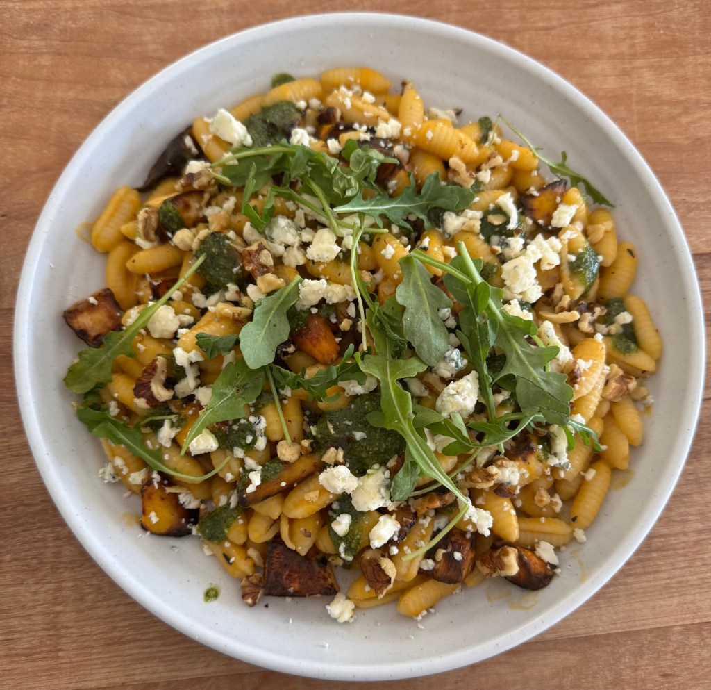 We’d like to introduce to you our newest addition to the pasta menu: Fall Roots with Sage Pesto. This dish starts with roasted tri color carrots, includes a sweet potato puree and features a walnut and sage pesto works so perfectly with the root vegetables. Even more exciting, the addition of gorgonzola cheese adds a layer of creaminess and tanginess that the dish needs. A little added arugula for good measure – you are absolutely going to love this one friends.